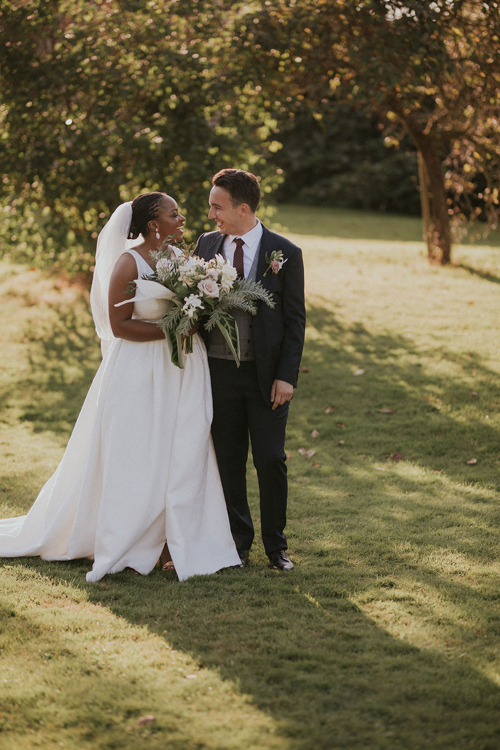 Our wonderful florist, Clare from See Rose Floral Design, was key to our classic, rich and contemporary aesthetic - I wanted dark, lush greens, blush, cream and nude tones throughout the flowers, with dimension added via king protea and pampas grass. I didn't give Clare much more to go on beyond that, but what she delivered in spite of my woolly vision was simply incredible. My bouquet was the most beautiful bunch of flowers I think I'll ever see. I wanted a nod to my Caribbean heritage, so Clare made sure to include tropical leaves and anthurium to bring an island vibe to a lush English bouquet. The flowers were more or less our only decoration, which we have no regrets about - they looked incredible throughout the venue, and made clean up way more straightforward the next day!
