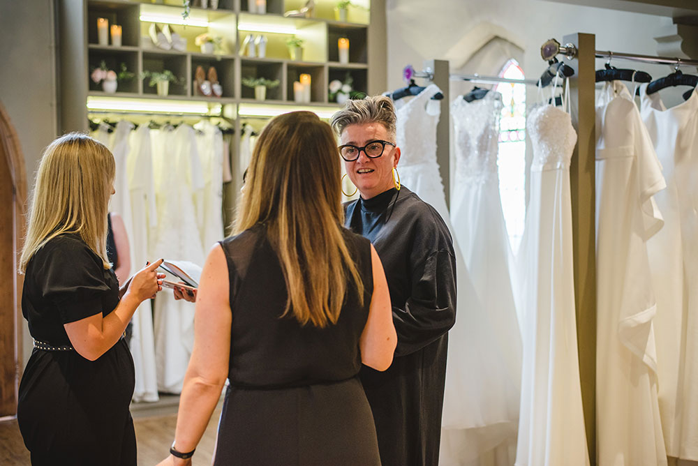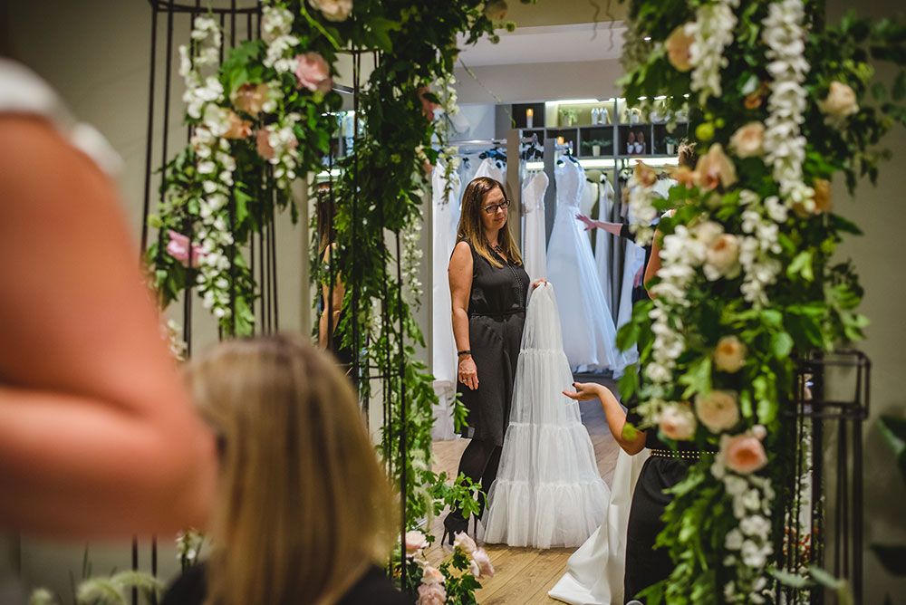 I take the UK’s most well-known bridal designer, Suzanne Neville, and have her work 12 hours on her heels not just as a high profile sales person but to celebrate that there is a real indefatigable expert committed to making the best dress of my clients’ life.