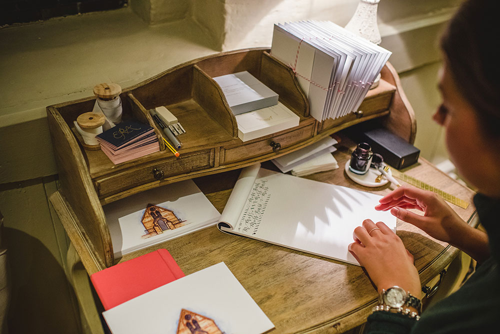 Even Ella, the calligrapher, arrived through an earnest and polite email wondering if she might collaborate with Miss Bush. With a few days’ notice Leah, Miss Bush’s digital manager and talented artist, had re-run her prints of her Chapel illustration to be customised with ‘live’ inscriptions on the night.