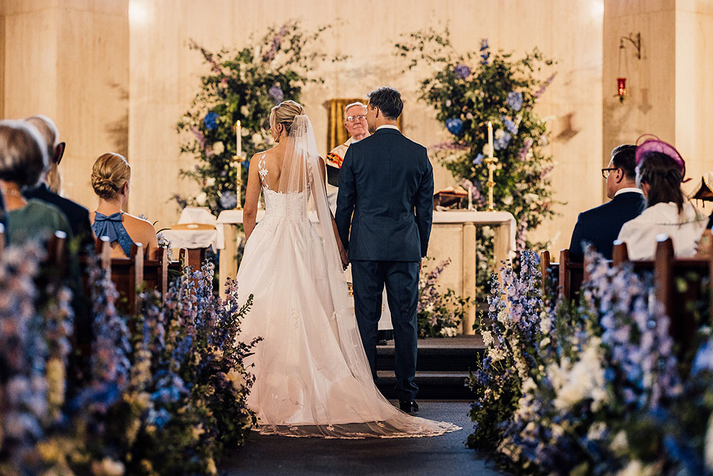 Alannah and Paul's beautiful wedding took place in mid June at St Joseph's Catholic Church in Guildford, followed by a traditional marquee reception at Alannah's dream wedding venue, Loseley Park. The day was styled by Miss Bush favourites Susie Evans and Gill Pike Florist, bringing the outside in with tons of fresh, colourful flowers in shades of blue and lavender amongst classic off whites and green.