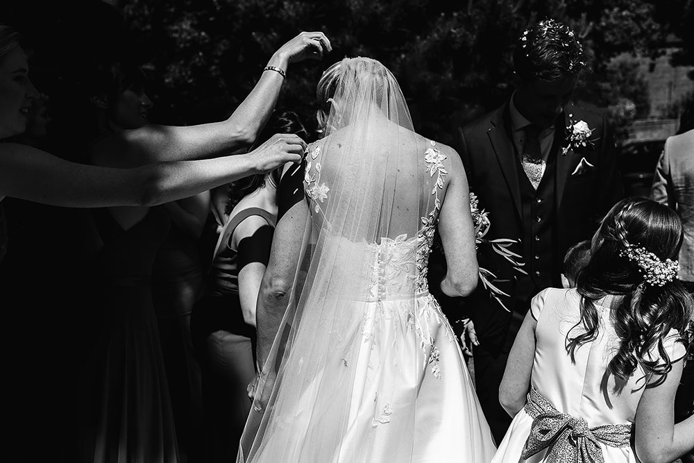 Alannah wore a special bespoke Suzanne Neville wedding dress, which featured elements from Romance and Amethyst, along with the addition of some sentimental lace appliques worked on by the brides aunt.