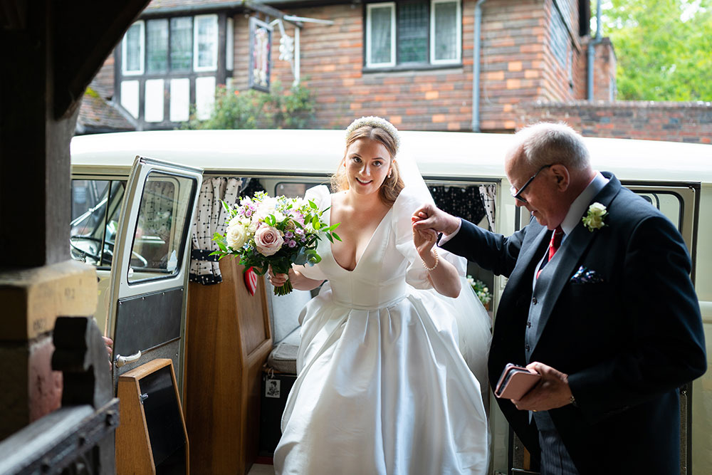 We fancied an English country garden-style wedding with some formality and tradition but also a day where all our family and friends could feel relaxed and have a really good time! It was a real privilege to get married in such a historic church, which has been standing for over 900 years and which houses Thomas Boleyn's (Anne's dad!) tomb. My dad and I were taken to the church in a really cool VW camper van, which was fun and also practical being able to house the size of my skirt! My Mother-in-Law, Yvonne, my Mum Liz and friends did the church flowers which were absolutely stunning and exactly as I'd hoped, pretty blues, pinks, whites and greens.
