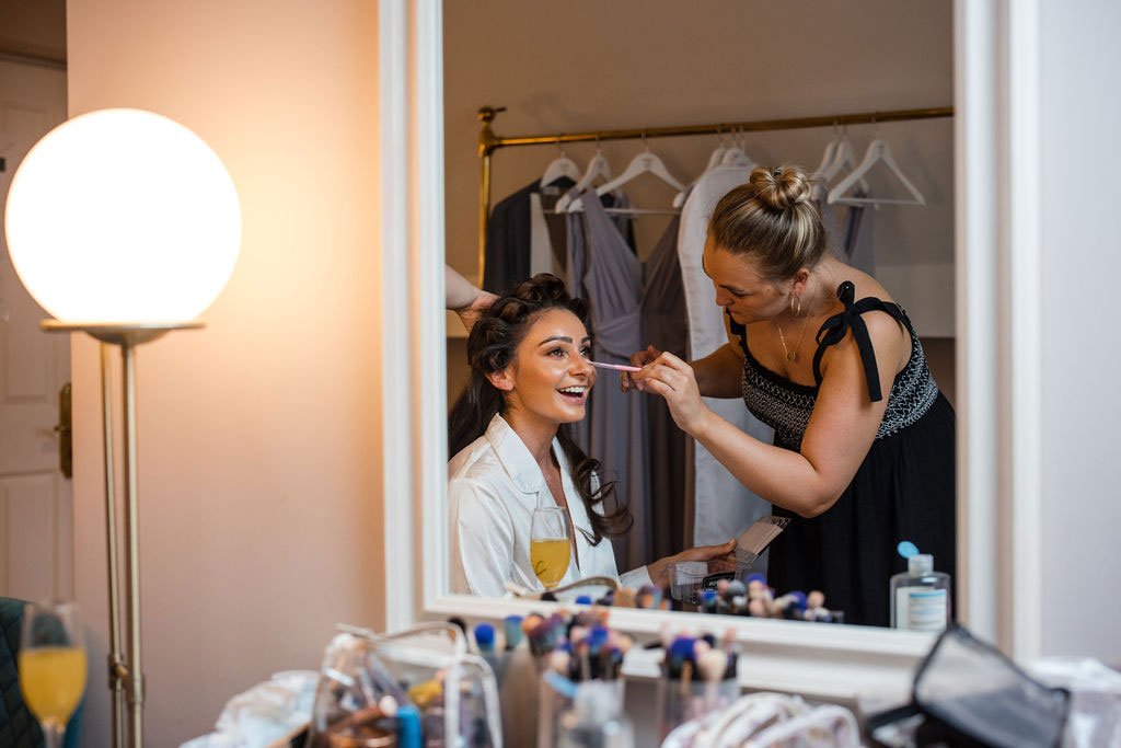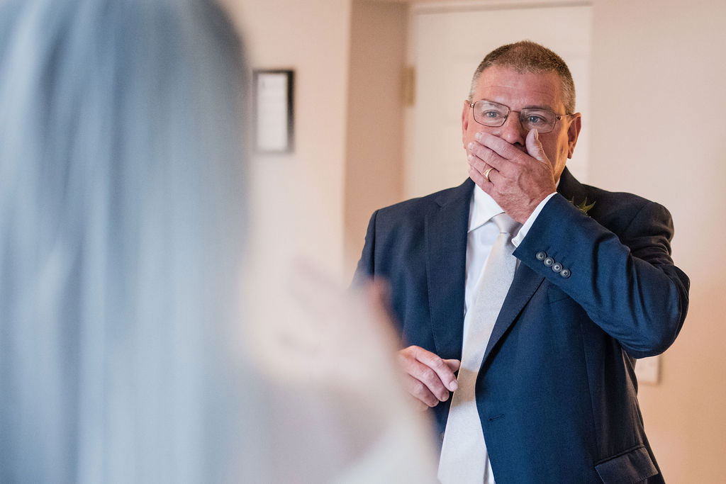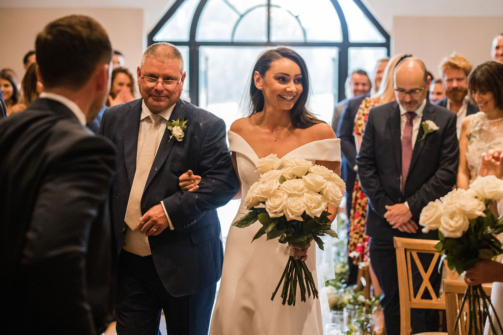 The bride chose Gabrielle by Suzanne Neville, which fit to perfection with a structured bodice and chic off-the-shoulder plunging neckline. The dress was 'love at first sight' for Becca, who knew it was the one before even trying it on! To accessorise, Becca took full advantage of the skirts thigh high front split by choosing some glamorous sparkling strappy sandals from Dune. She finished her look with a beautiful two tier veil by The Couture Veil, and a pair of chic, simple diamond stud earrings with matching necklace from Carat London.