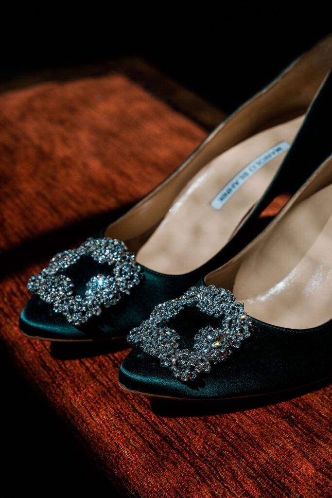 I kept it very simple. I loved the back of my dress so I had my hair in a ponytail to keep everything really classic. The dress has a slit so I obviously had to get amazing shoes and there really was no other choice other than Manolo Blahnik. I found the most beautiful emerald green ones that matched my bridesmaids dresses perfectly.