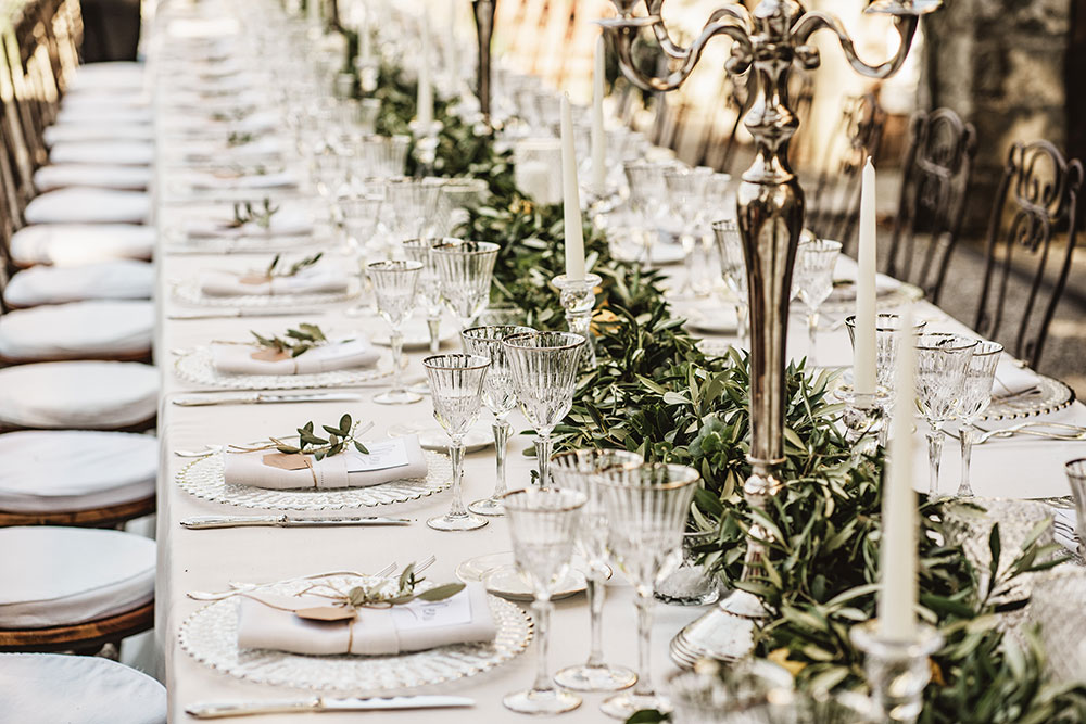 Growing up my memories of Italy would be dining outside on one big long table at various family members houses, eating and drinking until we were fit to burst and sitting out until the stars appeared overhead. We wanted to recreate this for our special day to give a sense of togetherness and love. We consider our friends very much family and so having this beautiful long table outside overlooking the Tuscan hills and being all together as 1 table was everything we could have hoped for.