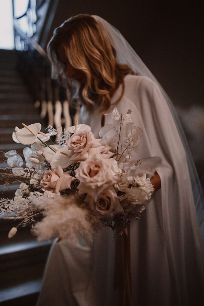Christa was a super stylish bride, opting to combine two stunning pieces from our top designers, Suzanne Neville and Jesus Peiro. The dress was Pandora by Suzanne Neville, a sleek, comfortable gown with an elegant v back, which Christa accessorised with one of our incredible showstopping Jesus Peiro capes. This allowed our bride to create two very different looks, wearing the dress alone with a striking lace edged veil for a more traditional bridal feeling during the ceremony, adding the cape later on for the reception.