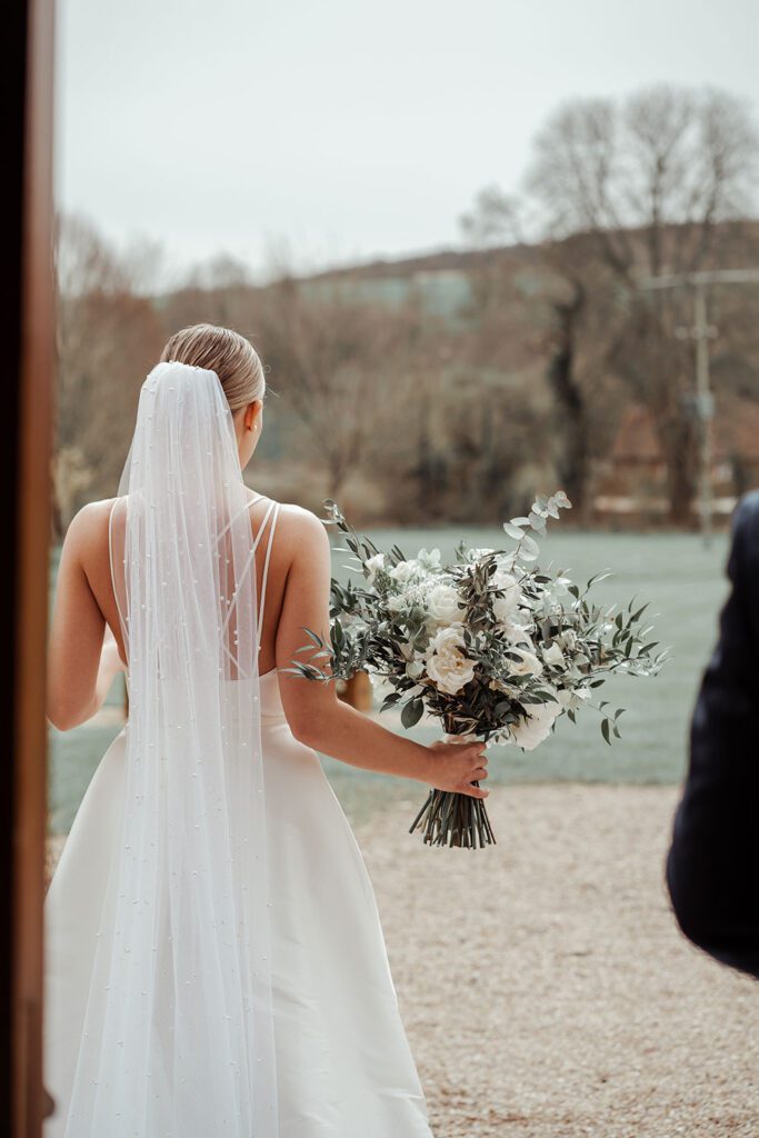Clare styled her chic, elegant Jesus Peiro 121 wedding dress with a sleek and classic low up do, along with pearl Sophia Webster heels that co-ordinated perfectly with her pearl studded veil.