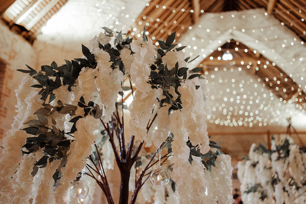 With Tithe Barn as our venue it really is a blank canvas for us to decorate as we wished. We had canopy fairy lights draped across the ceiling, hired in faux wisteria trees and scattered lanterns and candles around the barn. Our colour theme was white, gold and emerald green as I wanted something quite timeless and simple to match myself and my beautiful bridesmaids.