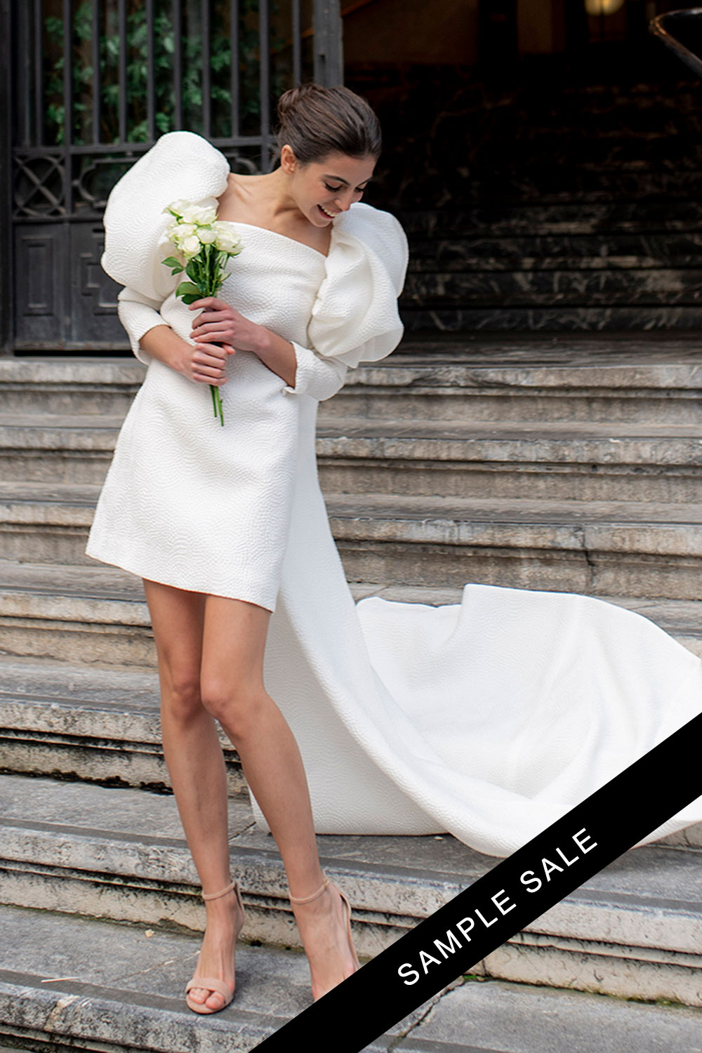 A striking showstopper of a dress made from exquisite textured silk. With elbow length sleeves with voluminous puff shoulders, the dress has a short straight mini skirt, with a striking cape with sweeping train to the back. Ideal for fashionista brides who want to make a statement with their bridal outfit, or show off an incredible pair of shoes!