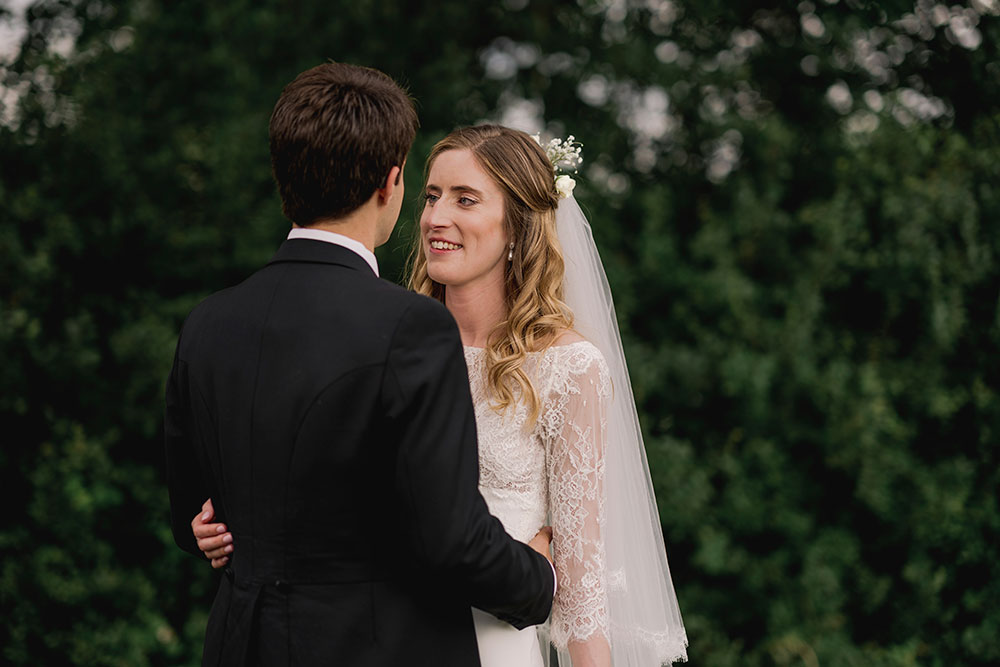 Elizabeth wore a customised version of the delicate and pretty 8076 wedding dress by Jesus Peiro, which features elegant elbow length sheer lace sleeves and a graceful boat neckline - the perfect choice for her July wedding in the countryside.