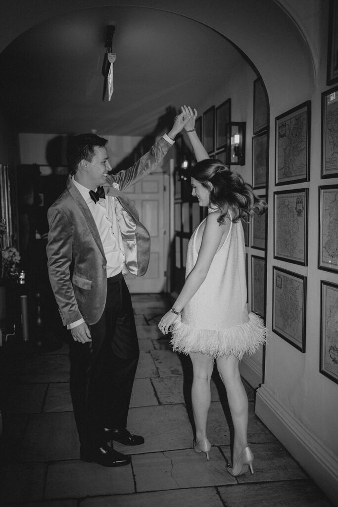 Matt and I were really keen for a smart, refined wedding day with modern elements spun in to make it feel as far away from stuffy and hyper-traditional as possible. I work in weddings and was super inspired by weddings in the US. We went for a Black Tie dress code and the groom and groomsmen wore black velvet jackets. Although the style was smart we wanted the atmosphere to be relaxed and comfortable and our lovely celebrant India and magic-maker coordinator Georgie made that very possible. I was set on having lots of personal touches that made our guests say 'that is so Em and Matt' and I think we succeeded from a little miniature dachshund figure at the back of our cake to hand-illustrated menus. Our venue also completely embodied this which really helped.