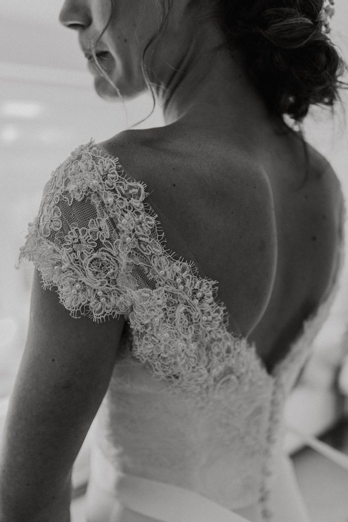 My style was very traditional I would say. I’m quite fortunate in that I’m tall and ‘bean-pole’ like so I could get away with a figure hugging dress – I always had a feeling I wouldn’t go for a big dress. The Botticelli is very simple in detail so the wow factor came from the shape. The Sassi Holford lace jacket added a little bit of detail and sparkle but complemented the dress really nicely too. Jo added on the beautiful ribbon to it so it lay over the top of the ribbon on the dress and seamlessly fitted them together. I then had a beautiful waterfall veil which was the same length as my train – I absolutely loved it when it all came together!