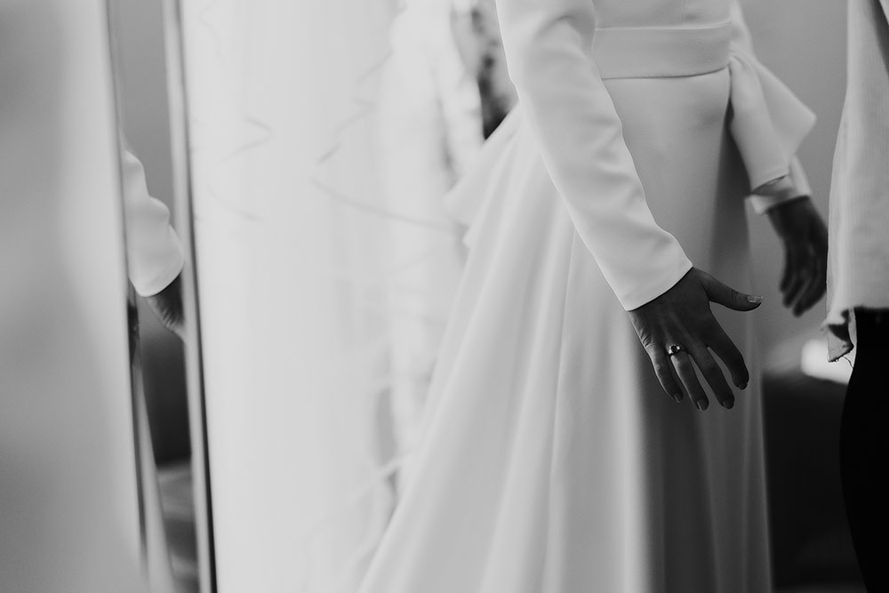 I chose the Jesus Peiro 164 dress. I saw the dress online and knew it was the one! I always wanted sleeves and an open back; simple but elegant. The addition of the belt with the ruffled detail was perfect to add a little “something” to the dress. The weight of the fabric was everything - the dress moved with me and wasn’t clingy, which I had felt trying some other dresses. I was wearing the dress, rather than it wearing me!