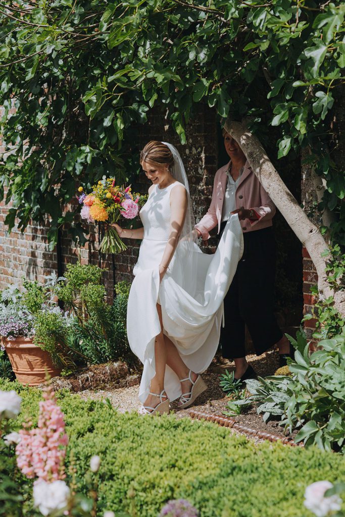I wore an Agnes Walker blush-coloured pansy comb hairpiece which was beautiful and perfectly suited the summer garden wedding. And I kept the Spanish and sports luxe vibes going with some white wedge espadrilles from Dune which I danced the night away in.