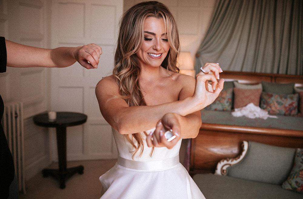 I chose gold strappy Giuseppe zanotti sandals so that I could wear them again… I didn’t want to go for a traditional white pointed bridal pump. I had my hair down as I have so much of it (and I always wear it up at work) so I feel more “done” with it down! I decided to go with less is more so jewellery wise I had little droplet earrings, an eternity ring and then my wedding band and engagement ring. My veil was 12 ft long and custom made, embroidered with “Mr and Mrs Duff” at the edge to give it a modern feel!