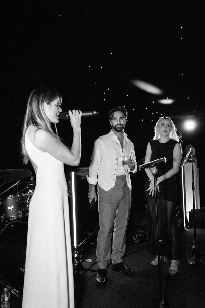 Georgia is our first ever featured bride to wear a dress from Suzanne Neville's 2023 Opulence bridal collection. With a crisp, modern silhouette, Coworth by Suzanne Neville features a v-neckline with delicate shoulder straps. Below the fitted bodice is a full wrap skirt, revealing a glamorous front slit. Statement heels are an absolute must for a split skirt wedding dress and Georgia styled it perfectly, opting for iconic Jimmy Choo diamante heels.