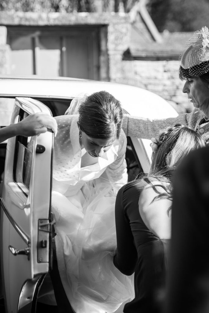 Georgie wore Jesus Peiro 927 wedding dress for the wedding, which she made her own with the addition of a unique bespoke collared shirt in one of Jesus Peiro's sheer dotty fabrics. This allowed her to cover up for church and then change her look later in the day - such a fab flexible bridal look!