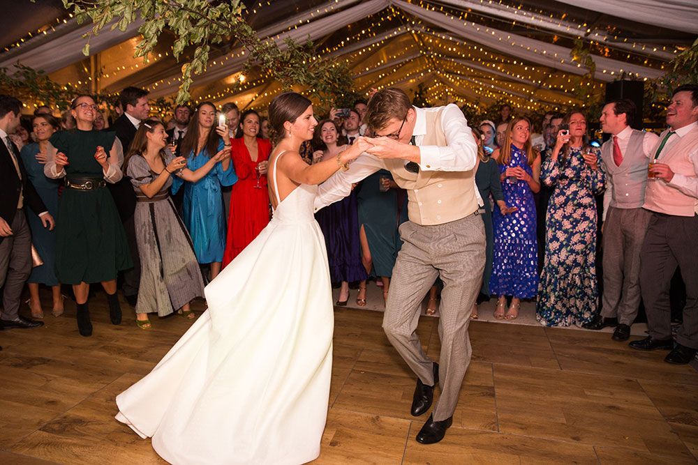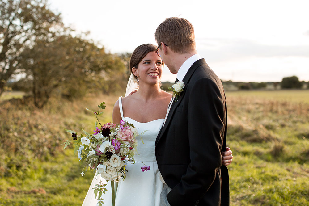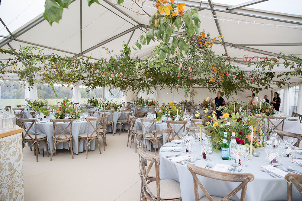 I really want to stay clear of the twee country marquee wedding that you see a lot of. I decided early on that I wanted a clearspan marquee to make the most of the views at the reception. The marquee was a perfect blank canvas to work with. Millie Richardson, my florist, was the absolute dream at making the marquee look amazing. We went big on Autumnal foliage and florals, with big messy table centrepieces and foliage all through the roof. The flowers added all the colour and kept everything from looking too prim, I couldn't recommend Millie more - I love her!! I hired lounge furniture and rugs from Wedhead who have some nice options that are a bit different to the norm, I also decided to make 130 napkins from vintage french linens to add in more colour and a bit of extra personality.