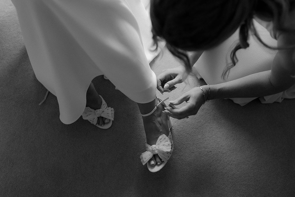 For our church ceremony, I replaced the original Calla sleeves (which we made detachable) with the Jesus Peiro, silk puff sleeves. I prioritized fullness and length over embellishment for my veil, which was a cathedral-length design by Nortier, with a fine trim around the edge.For dinner and cocktails, I took off the veil and replaced the sleeves with the original, Calla sleeves. I am so glad I kept these, as I'd always adored them, and they allowed me a bit more movement for dancing during our surprise music set in the middle of dinner!Later for the dance floor, I removed the sleeves altogether for a completely strapless look - and added a custom-made pearl encrusted headband.Throughout the day I wore my hair in a low, loose bun, and kept jewellery simple with a pair of Miss Clemmie, gold pearl drop earrings - which I actually spotted in the fitting room at Miss Bush.For my shoes, I went with a pair of Loeffler Randall's Camellias, with a few rhinestones for a bit of something extra. I also wore a gold pair the night before at our welcome party.Much, much later in the evening, I changed in to a shorter, strappy slip dress, which I was very grateful for when I ended up on the shoulders of one of the ushers!