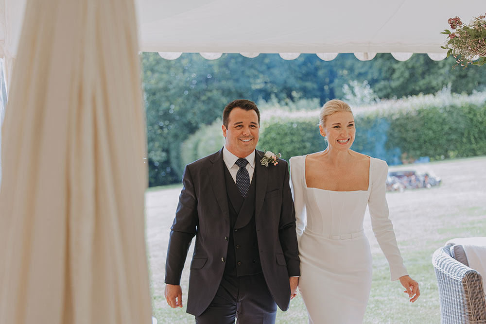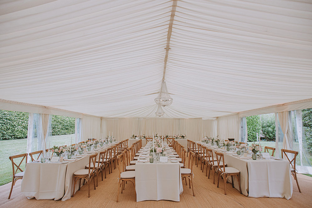 We had long tables in the marquee with lots of flowers and candles to make it feel intimate and romantic (we originally invited 150 guests, but due to covid reduced the guestlist to 50.) One of my favourite touches, were the 2 chandeliers hanging in the marquee.