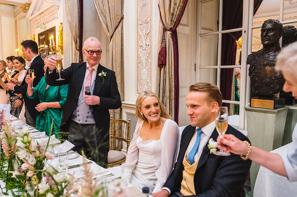 Photographer: Louise Adby Videographer: Skinny Boy FilmsVenue: Royal Automobile Club Church Florist: BulbousRAC Florist: Royal Automobile Club Bridesmaid dresses: Maids to Measure Band: Flood the Floor
