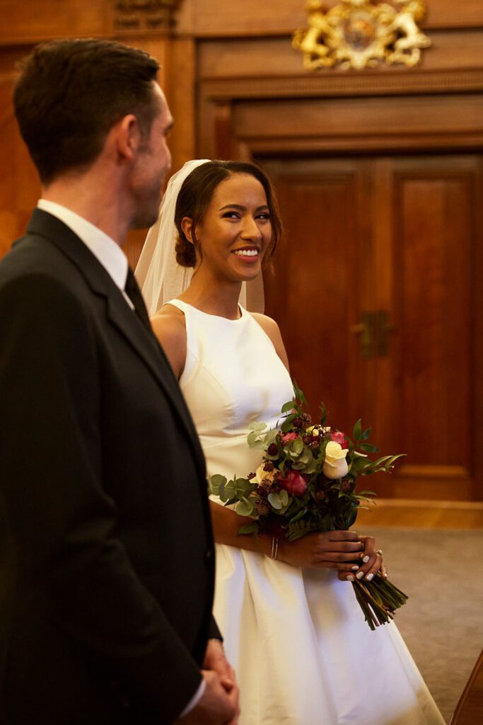 We had to change our entire day - we'd initially planned for a 120 person wedding and had to scale back the guest list to 15 people, so it seemed strange to still go ahead with our huge venue. With the guidance of the lovely Penelope Cullen from Tigerlily Weddings, we managed to plan a significantly smaller day with a luxury feel. We got married in a registry office at Old Marylebone Town Hall. The building already had an ornate and grand aesthetic so we didn't need to do any decorating. Because everything was so last minute we left most of the decorations down to the venues, which helped take the pressure off us. Afterwards, we took pictures outside with our family and friends and then we all headed to Fortnum & Mason for afternoon tea. We were all seated in a socially-distanced way and left doors open for ventilation. We did speeches and for the entertainment portion of the night did a few wedding-related quizzes. Dancing wasn't really allowed but Jamie still managed to spin me around for the photos!