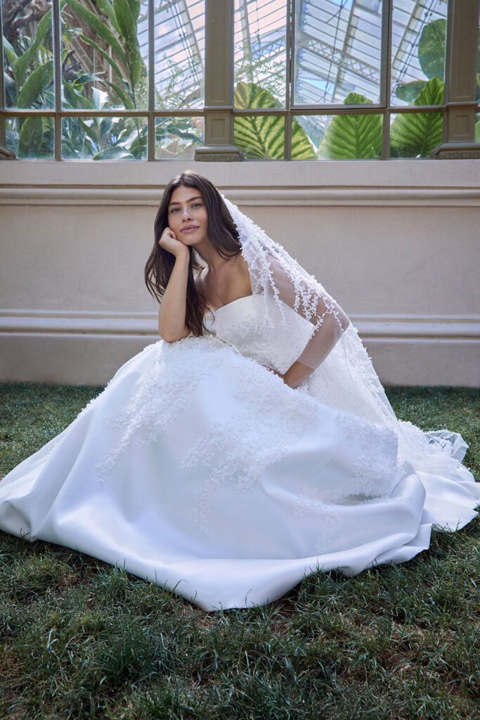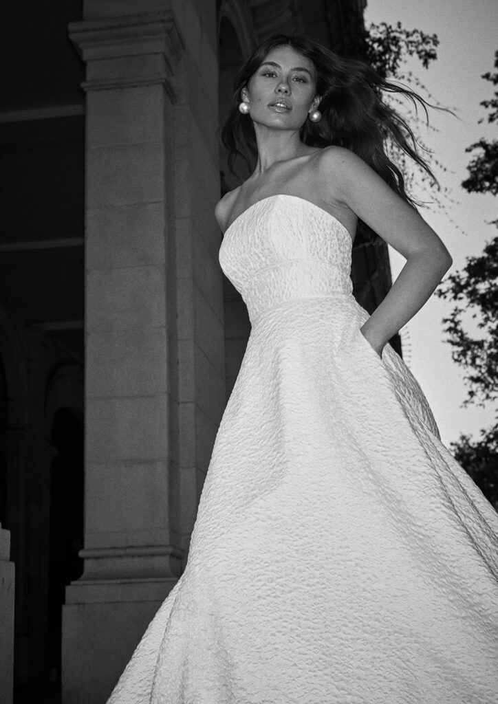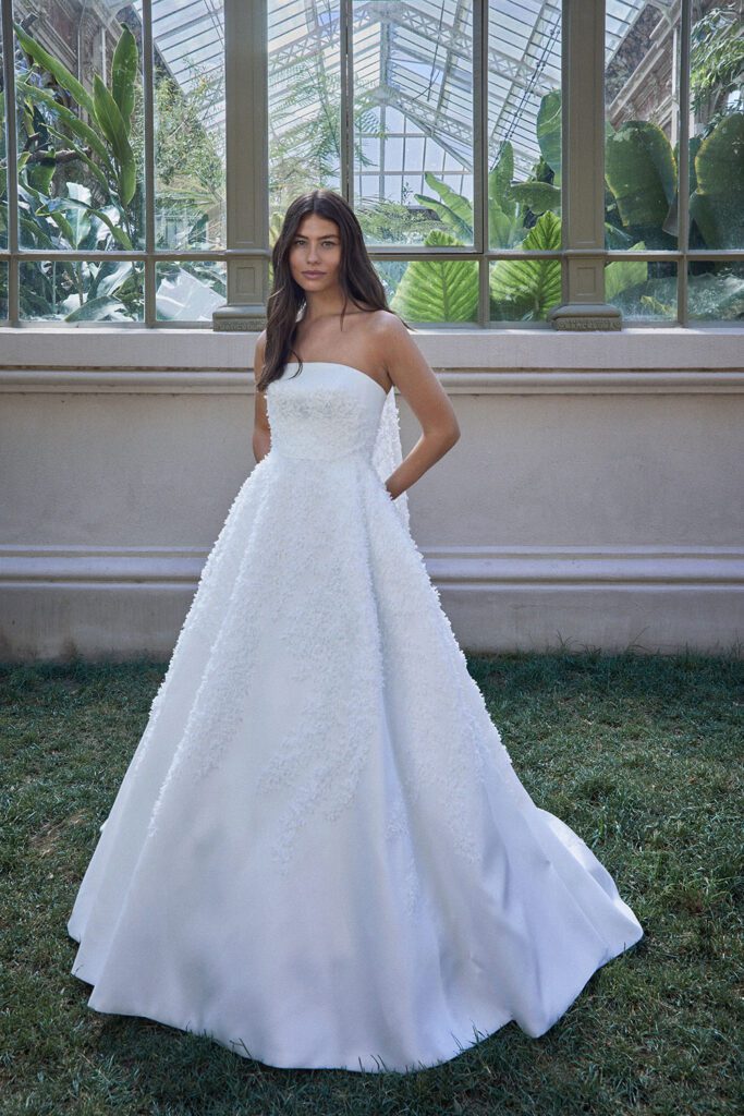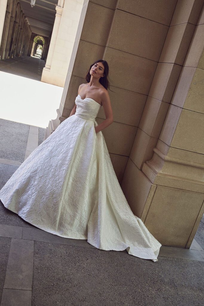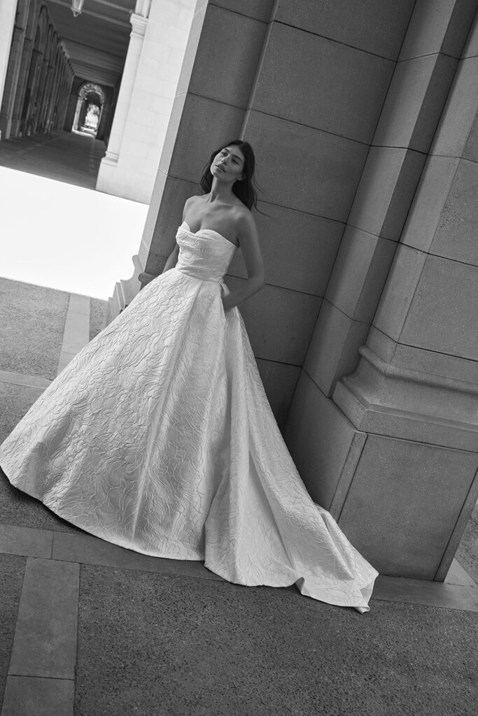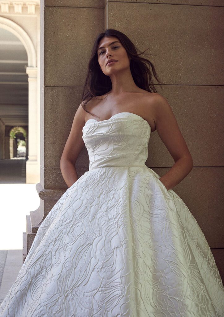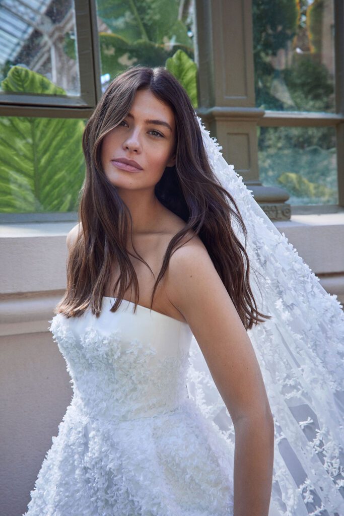 Highlights include the incredible 2617 textured strapless wedding dress with matching veil, the chic 2661 bridal blazer and the stunning 2666 strapless floral wedding dress.