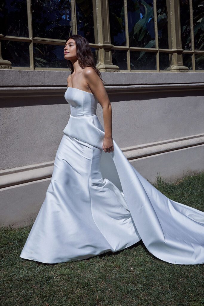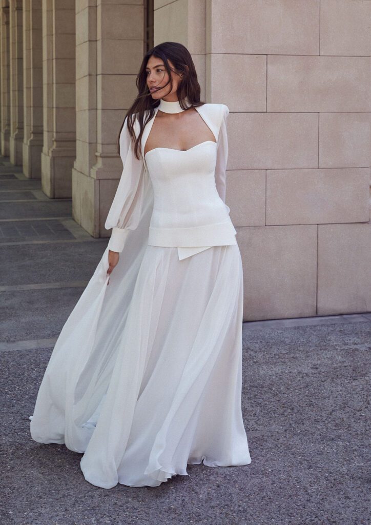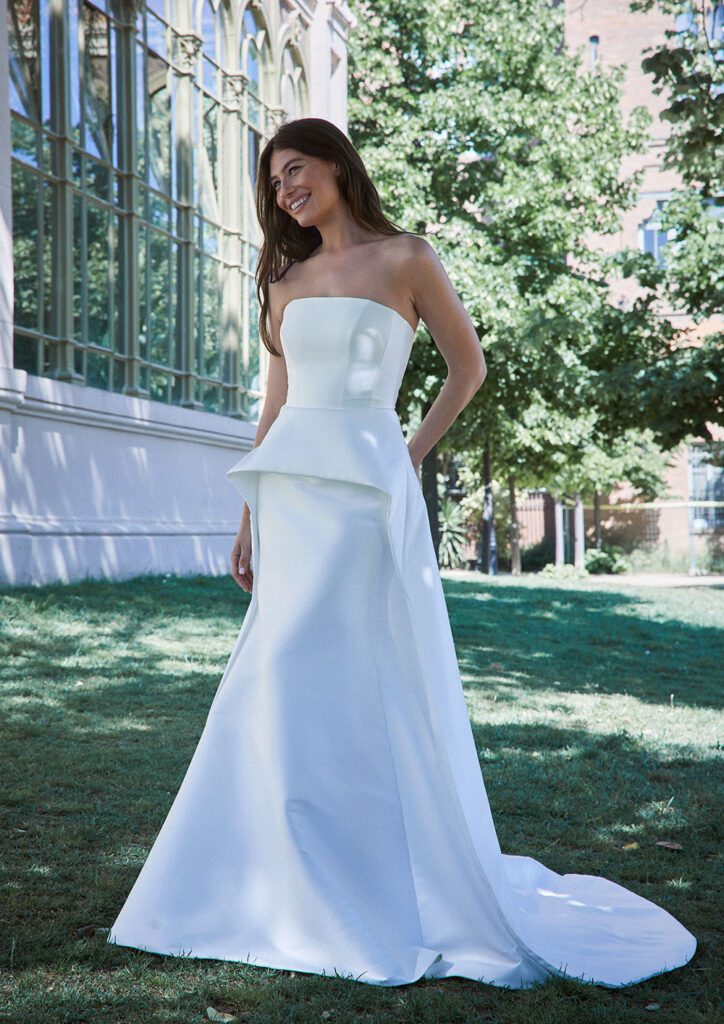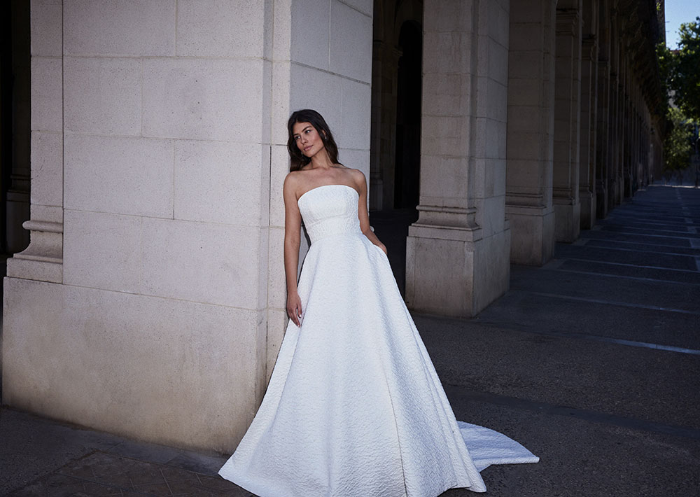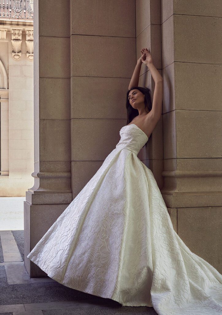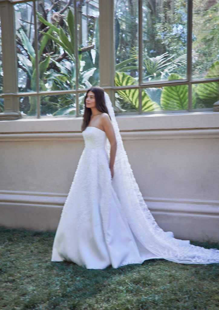 Highlights include the incredible 2617 textured strapless wedding dress with matching veil, the chic 2661 bridal blazer and the stunning 2666 strapless floral wedding dress.