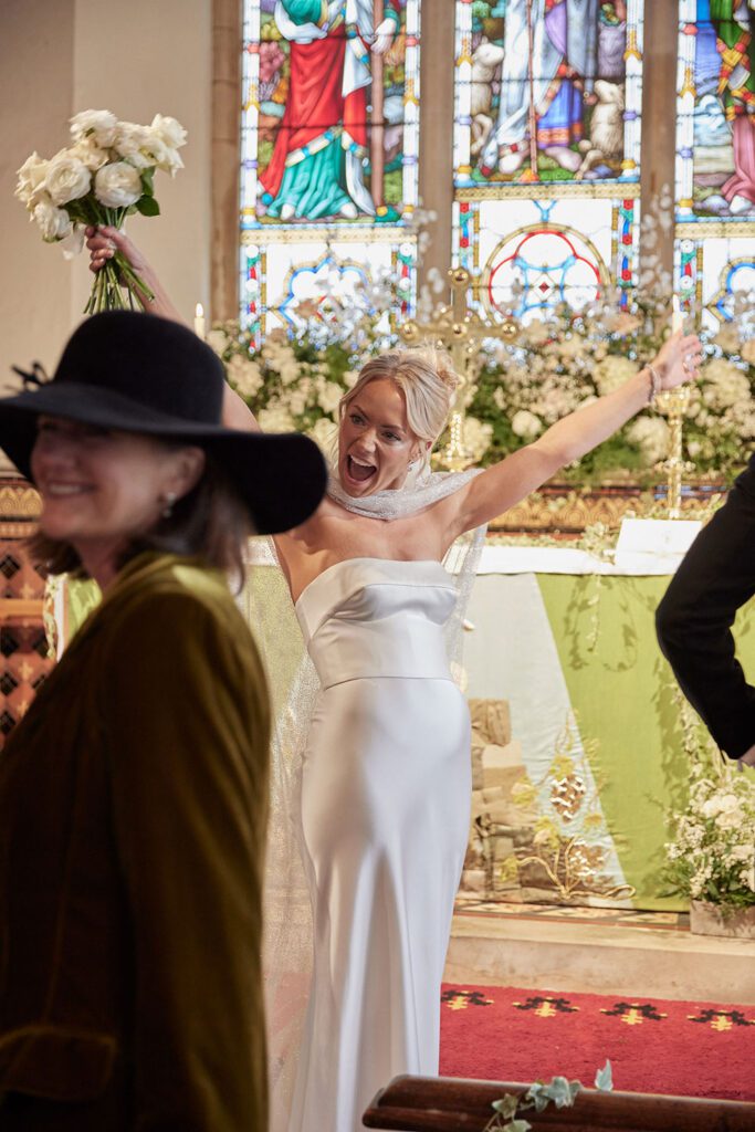 For the evening reception, Hannah switched her cape for a chic detachable feather trim with sleeves, also by Jesus Peiro.