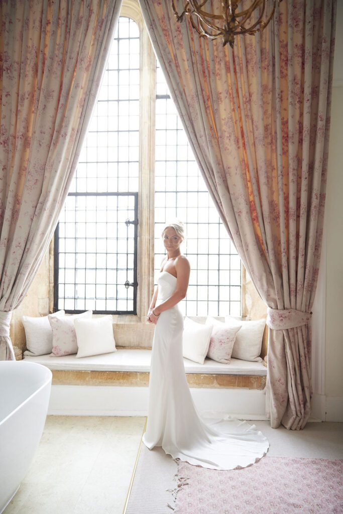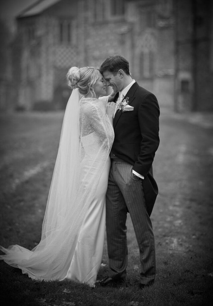 Hannah wore a stunning custom version of Jesus Peiro's 2316 wedding dress, switching the skirt for the sleek satin mermaid from 2414. To finish her look, Hannah commissioned our in-house design team, Nortier, to create a glittering statement polo neck cape made from exquisite embellished tulle.