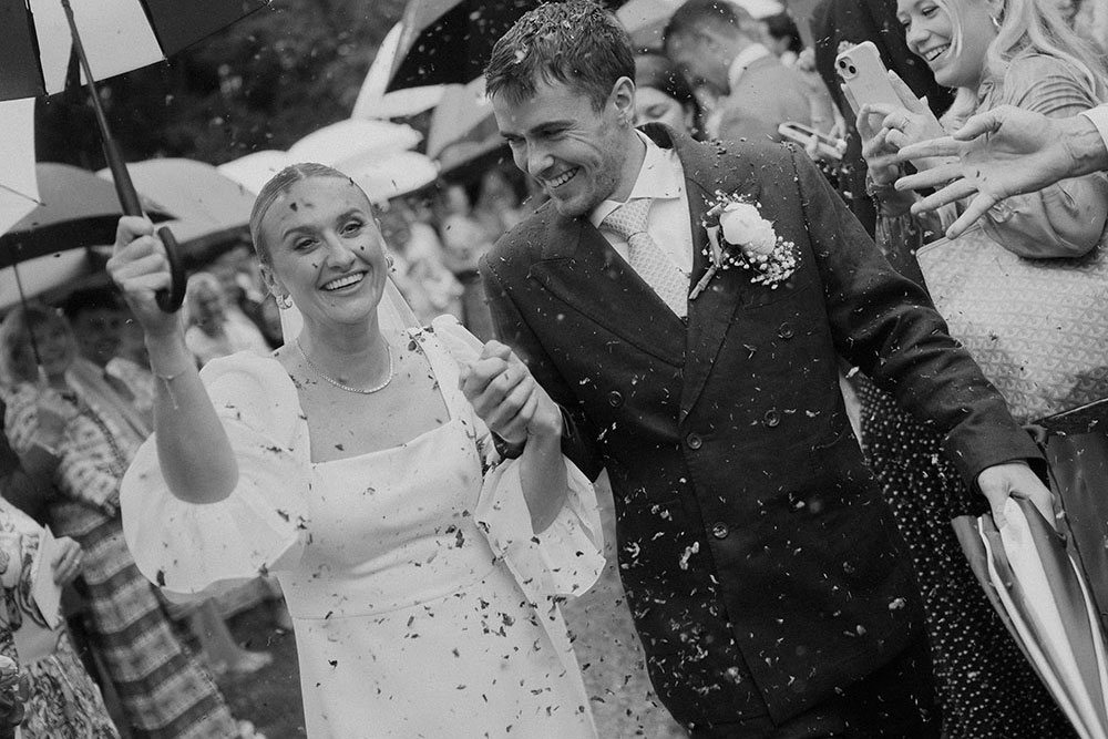 Driving away from the church in the pouring rain with an open-top car.