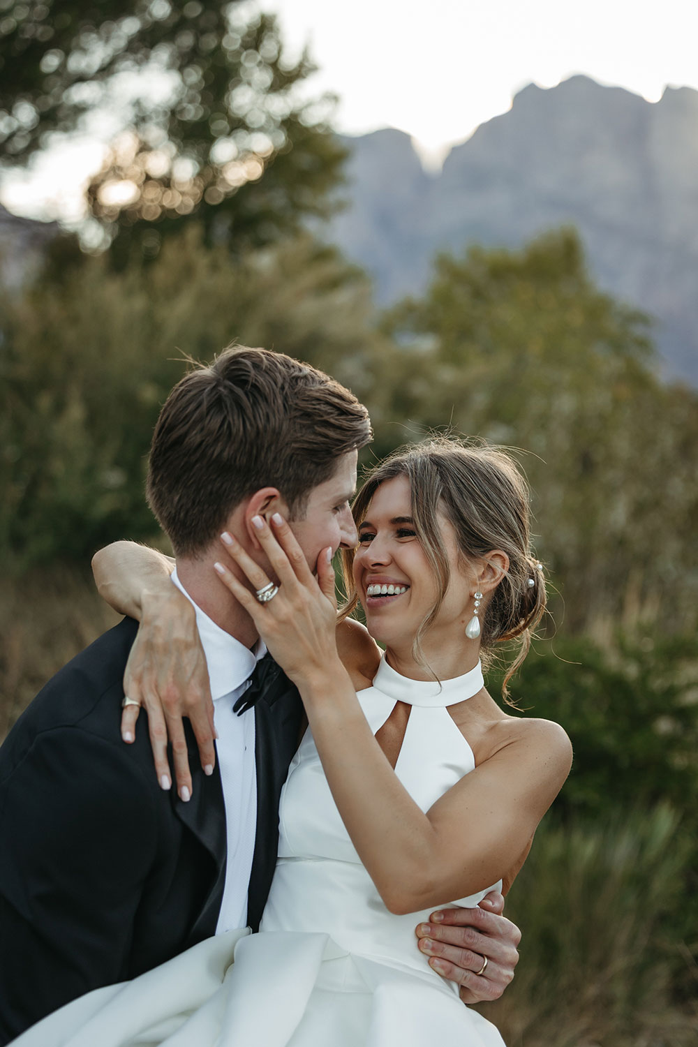 Tarryn wore a custom version of Jesus Peiro's 2647 wedding dress; featuring a classic Jesus Peiro silhouette with a high collar and deep v-neckline, full skirt with wide cummerbund waist. Tarryn made the dress her own, switching the crossed straps for a full open back, making it perfect for the South African climate and adding even more drama to the bold silhouette. To style her dress, Tarryn added a romantic full length veil with pearl embellishments and matching pearl jewellery. Tarryn completed her look with a pair of pearl studded sandals from Charlotte Mills - snapped up from the Miss Bush Vinted!