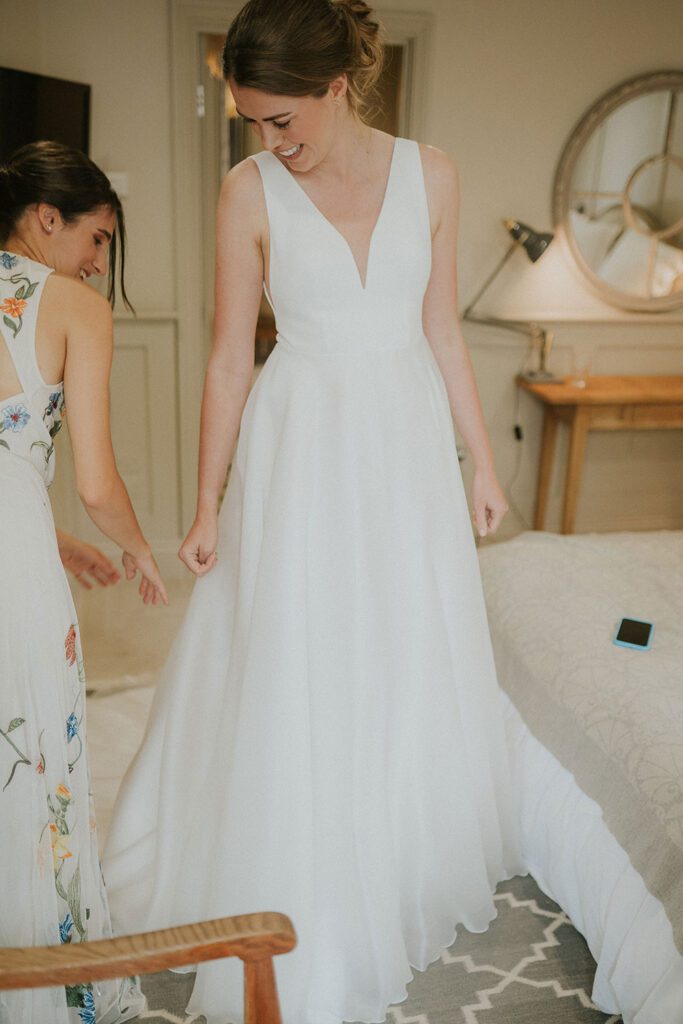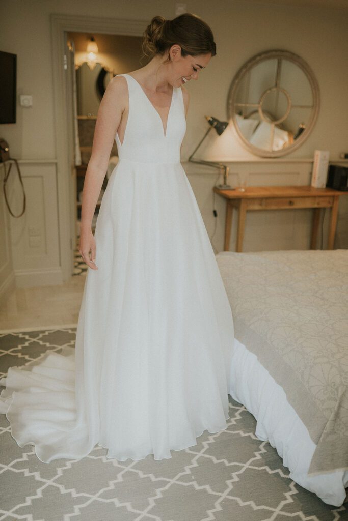 My dress was a bespoke Suzanne Neville with Swan on top and Serrano at the bottom. I would have loved to have worn Seranno on top and bottom but this option gave me a little more structure and coverage. I loved how simple and clean it was, and that Suzanne is an English designer. We tried to keep our wedding as sustainable as possible so sourcing the dress locally was important to me. I would have bought a dress second hand but I'm nearly 6ft tall. I'm hoping to sell mine on so that it is worn and loved again.