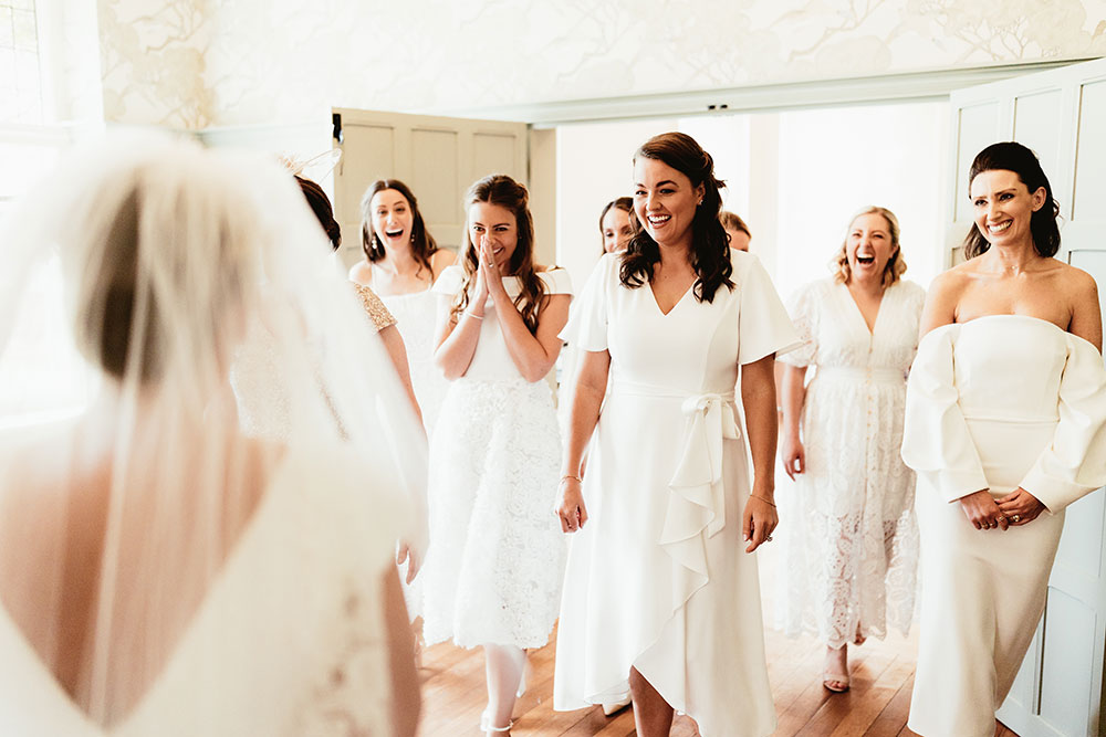 Juliet's bridal outfit is the perfect example of how you can take a simple, classic wedding dress, and really make it your own with unique accessories and styling. With a custom Suzanne Neville wedding dress, combining elements of Darya and Delight, Juliet added an incredible bespoke tiara with two veils for a statement look and a bold, colourful bouquet. We've all been lusting after Juliet's chic Loeffler Randall shoes!