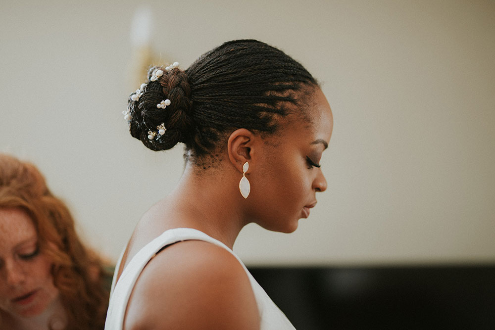 Because the dress was so sleek, I wanted to keep my hair and make up in the same vein. I did my own make-up, after much debate with myself - I love doing it normally, and as a woman of colour, have had a really hit-and-miss experience with professional make up artists. It's not always as inclusive as it should be, and in the end, I felt that no one knew my face as well as I did. My usual hairdresser styled my hair in long braids, and one of my wonderful bridesmaids helped me put it into a low bun on the day - I scattered lots of pins from Etsy through this, which added just a little bit of sparkle.