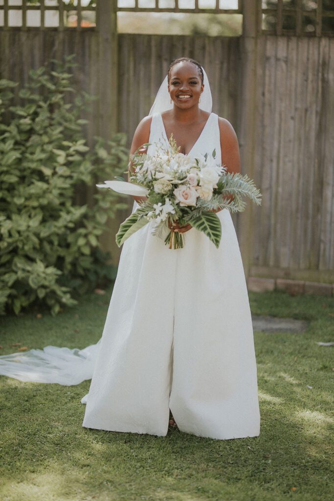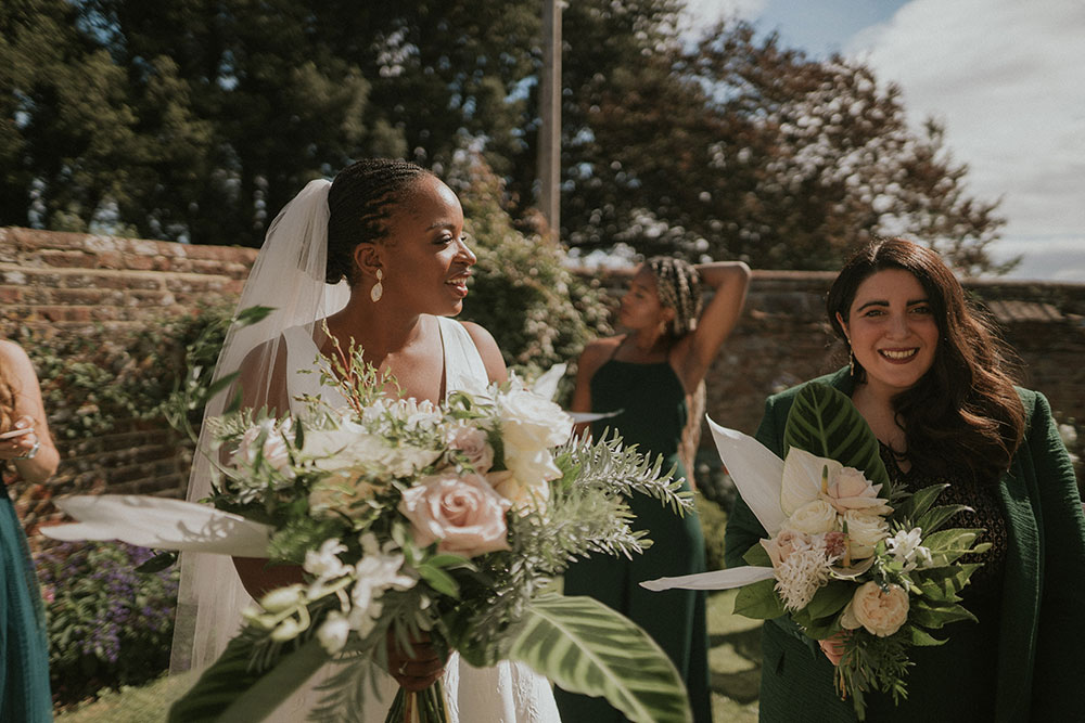 Our wonderful florist, Clare from See Rose Floral Design, was key to our classic, rich and contemporary aesthetic - I wanted dark, lush greens, blush, cream and nude tones throughout the flowers, with dimension added via king protea and pampas grass. I didn't give Clare much more to go on beyond that, but what she delivered in spite of my woolly vision was simply incredible. My bouquet was the most beautiful bunch of flowers I think I'll ever see. I wanted a nod to my Caribbean heritage, so Clare made sure to include tropical leaves and anthurium to bring an island vibe to a lush English bouquet. The flowers were more or less our only decoration, which we have no regrets about - they looked incredible throughout the venue, and made clean up way more straightforward the next day!