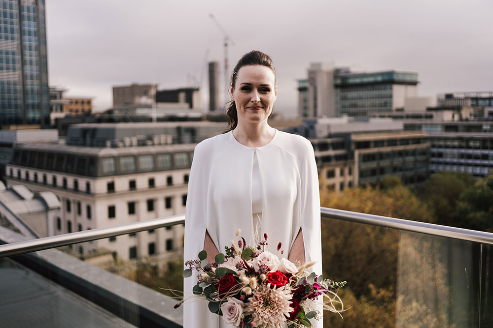 Lisa wanted a look that wasn't too traditionally bridal, and we put together an outfit featuring chic cigarette trousers and a simple top, which made the perfect base for her statement cape. All from Jesus Peiro, these elements came together to create the perfect bridal outfit for Lisa, which was comfortable whilst still feeling special and one-of-a-kind.