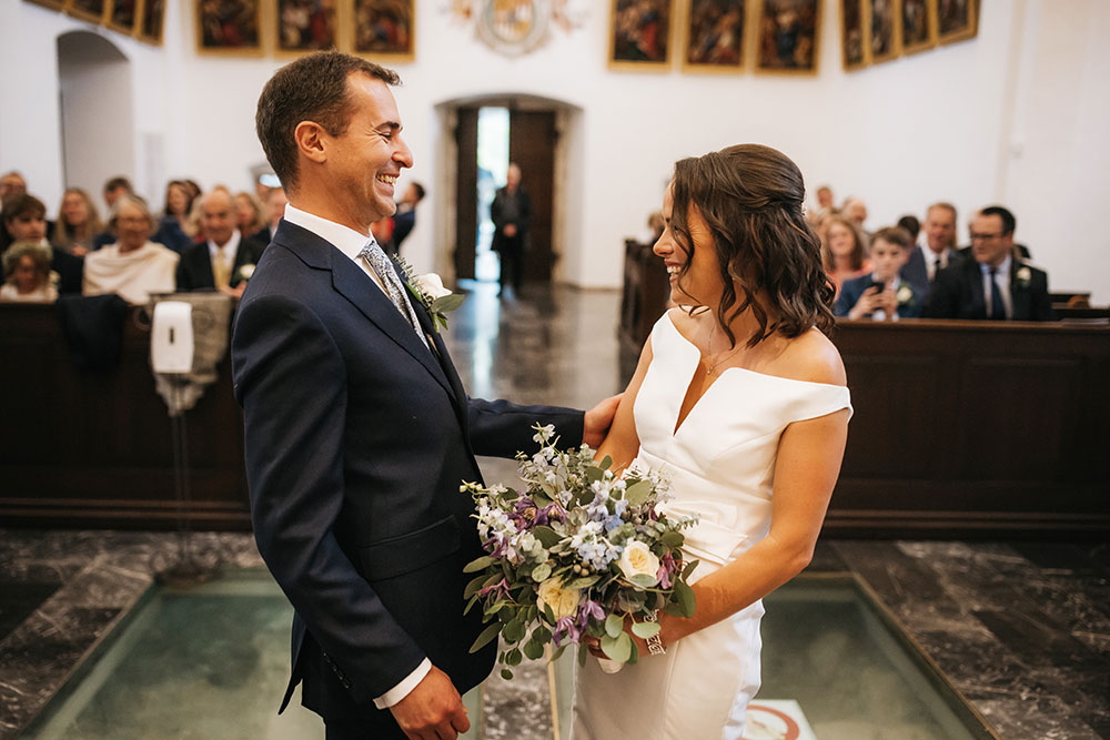 In 2018, we visited Lake Bled in Slovenia and knew that it would be the perfect location to celebrate our marriage. Our styling was simple and elegant based around the backdrop of this stunning location. We chose a blue liberty print and blue and ivory flowers. I sourced my blue lace shoes on Vinted and they cost just £7! For the wedding where possible we used local suppliers and traditions.
