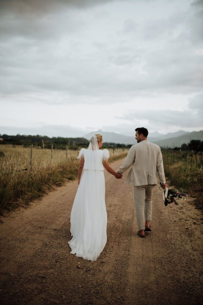 Sammy wore Jesus Peiro's 2232 dress with a customised neckline based on the square neck from style 2214. For the ceremony and portraits, she added the boxy 268 top, trimmed with glamorous feather shoulders. To style her look, Sammy added gold strappy sandals from Immacle, which were the perfect balance of glam and comfort - perfect for dancing the night away!