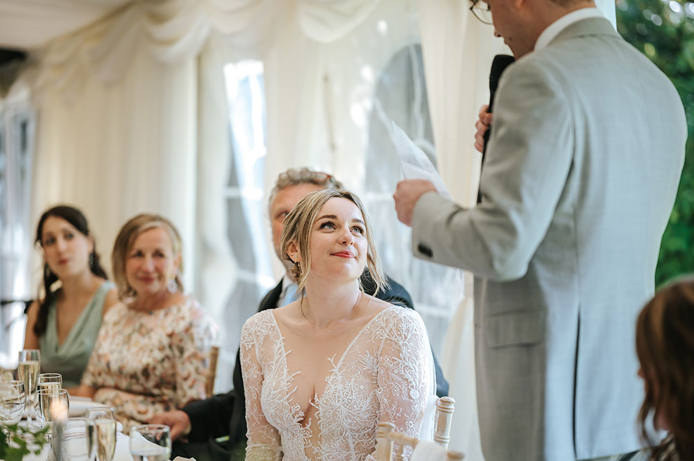 Our aim from the outset was to create our very own English woodland fairytale, mixing in hints of gold to match the rings and adding fairy lights to the tree-like centrepieces and external trees so they glistened in the evening. We were also heavily inspired by the Elven settings in Lord of the Rings, it being our joint favourite movie (!), so we added in touches of light ashy grey and tulle (enter Maya Dress!) which helped give the day a real timeless, ethereal quality.