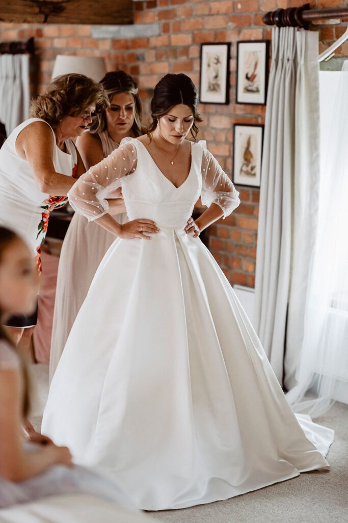 Sophie's dress was a special creation, based on Jesus Peiro's 2231 wedding dress. Sophie adapted the dress to make it her own, switching the standard 2231 skirt for the full, voluminous skirt from 8004. This worked wonderfully with the delicate dotty embroidered tulle sleeves and v-neckline. Sophie styled her dress with classic bridal accessories, opting for a full length cathedral veil, pearl jewellery and off-white satin block heels. We absolutely adored Sophie's evening look, when she switched the veil for a fabulous large satin bow.