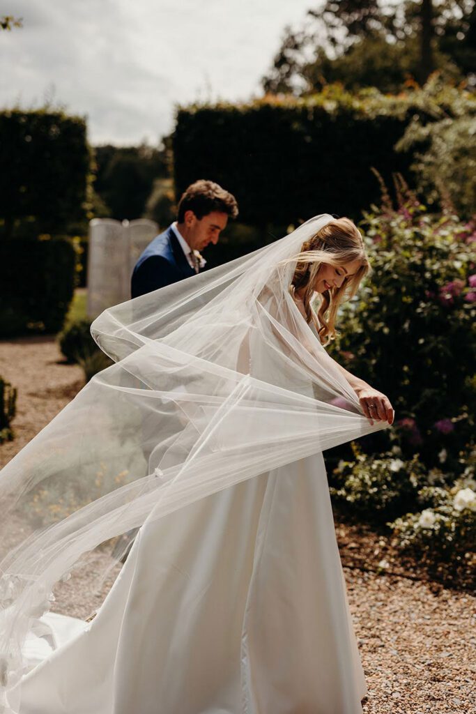 Joanne wore Suzanne Neville's Coworth wedding dress, which was just made for an English Country House wedding in Summer. The dress features a perfectly fitted bodice with wide shoulder straps and a v-neckline. Joanne chose to have the skirt customised without the split. To style her dress, Jo wore Loeffler Randall's iconic sandals in gold, along with an exquisite veil from Couture Veil adorned with romantic 3D flowers.