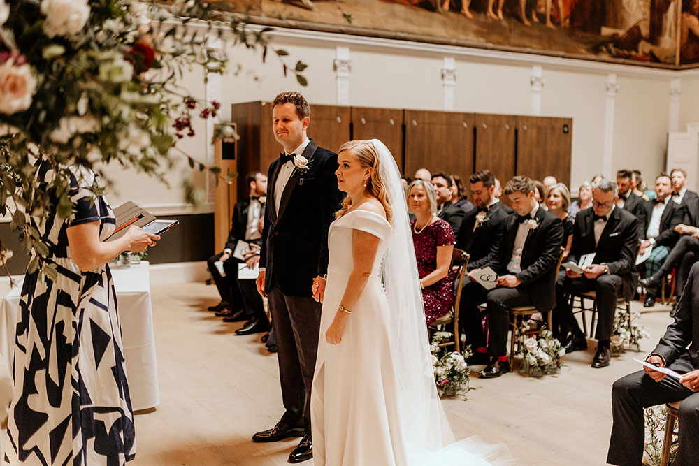 We got married at the RSA just off The Strand. We love London, live there, dated there and built our lives together there, so there really was no debate on location. The venue is the Royal Society of arts so were very lucky to have several styles through out the day. We started with all the Georgian grandeur and we kept things very traditional with black tie, neutral flowers and string duo. Then by the evening we had moved to the vaults surrounded by modern art, with our abstract cake, love band with saxophone and bow ties very much off!