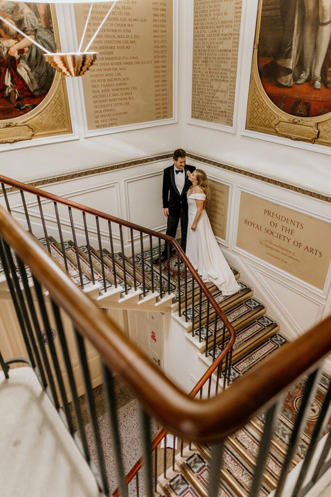 It has been a while since we have featured a wedding at The RSA, so we were delighted to see Charlotte and Charles' wedding drop into the inbox! It's a fabulous venue and we LOVE a central London wedding! Taking place in early April, the wedding is the epitome of chic London style, with portraits on the banks of the Thames with iconic landmarks as the backdrop. The venue provides the perfect location for a stylish black tie wedding, with tons of incredible art and architecture to create a unique stylish event.