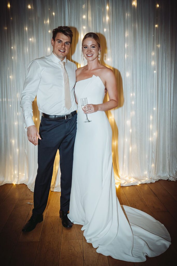 Fleur chose to wear Suzanne Neville's simple, elegant Hailey wedding gown, which she fell for thanks to its chic square neckline and floaty, romantic skirt. For the evening, Fleur then changed into the sleek Aurelia dress with strapless folded neckline - perfect for dancing the night away with her new husband.