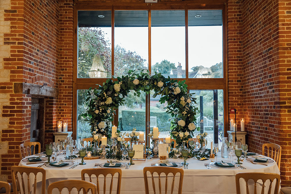The day was a romantic, warm, country, autumnal wedding with lots of natural wood, crisp whites, golds and greens. The barn looked beautiful on the day, better than I ever could have imagined. Full of candlelight and luscious green foliage. The flowers and the table centrepieces were gorgeous. We were married in front of stunning floral moongate, which was the centrepiece of the wedding decor. Our florists were the amazing Anne Marie from @rhubarbandbramley and Lizzie from @thebotanicalcompanyltd. We made quite a lot ourselves, including the signage, menus and place names.